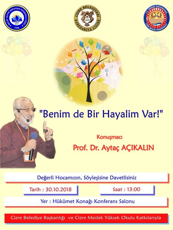 Cizre Belediye Başkanlığı ve Cizre Meslek Yüksek Okulu Müdürlüğünün Katkılarıyla, Üniversite yıllarında Okul Müdürümüz Ömer ZEREN'in de Hocalığını Yapan Hacettepe Üniversitesi Emekli Öğretim Üyelerinden Prof. Dr. Aytaç AÇIKALIN, 30 Ekim 2019 tarihinde "BENİM DE BİR HAYALİM VAR!" Söyleşisiyle Öğrencilerimizle Buluştu. Öğrencilerimizin ilgiyle dinlediği söyleşi renkli görüntülere sahne oldu. Değerli Hocamızın ayağına, yüreğine, diline sağlık diyerek katkıda bulunanlara teşekkür ediyoruz.